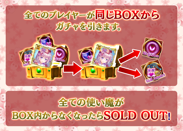- 【BOX内すべての中身が0】もしくは【BOX内の目玉使い魔の残数が0】になった場合、「SOLD OUT」となり、本シェアBOXガチャを引くことができなくなります。