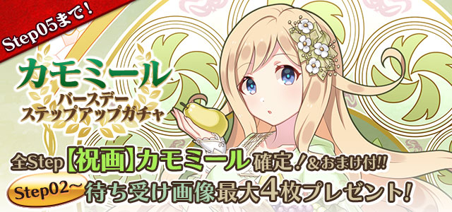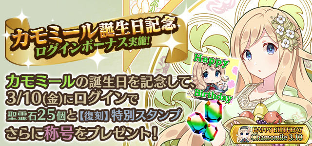 カモミールの誕生日を記念して、誕生日当日にログインすると「聖霊石:25個」と、掲示板で使用できる【復刻】特別スタンプや、称号をプレゼント!!