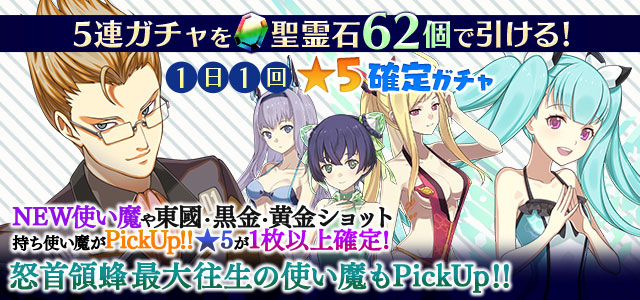 【一部NEW使い魔や東國・黒金・黄金ショット持ち使い魔などがPickUP】1日1回★5確定ガチャ