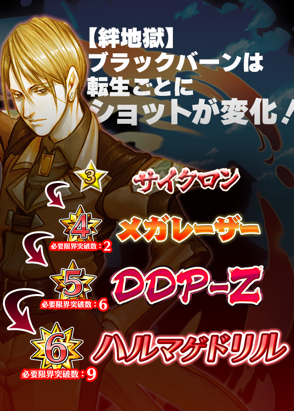 - 【絆地獄】ブラックバーンは転生すると、アリーナではアリーナスキル含め、現在のレアリティのショットとして扱われます。また通常のシューティングステージなどでのショット切り替えは、★3時のショットと現在のレアリティのショットのみ可能です。