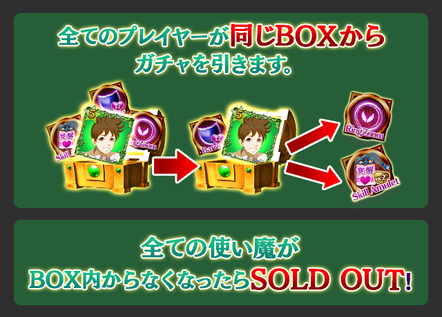 - 【BOX内すべての中身が0】もしくは【BOX内の目玉使い魔の残数が0】になった場合、「SOLD OUT」となり、本シェアBOXガチャを引くことができなくなります。