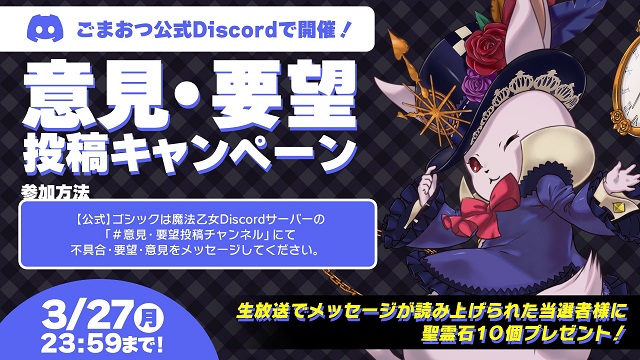 ・3月末実施予定の生放送終了後、生放送でメッセージが読み上げられたご当選者様には「ゴシックは魔法乙女」公式Discordアカウント(ユーザー名「ごまおつスタッフ#1486」)より、ダイレクトメッセージでご連絡いたします。