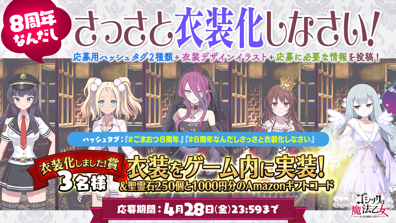 2023/4/1(土)で8周年を迎える『ゴシックは魔法乙女』の記念企画として、推し乙女(5乙女・5悪魔・学園乙女)の「おでかけ衣装」のデザイン案をTwitter上で大募集!