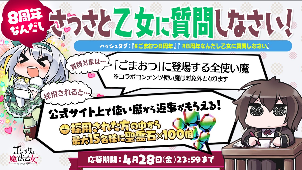 2023/4/1(土)で8周年を迎える『ゴシックは魔法乙女』の記念企画として、Twitter上で使い魔に対する質問を大募集いたします!
