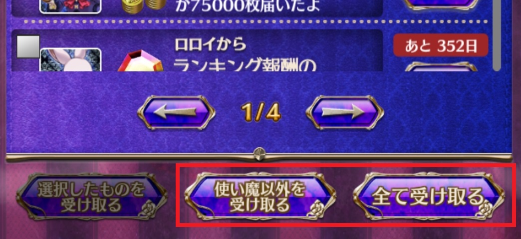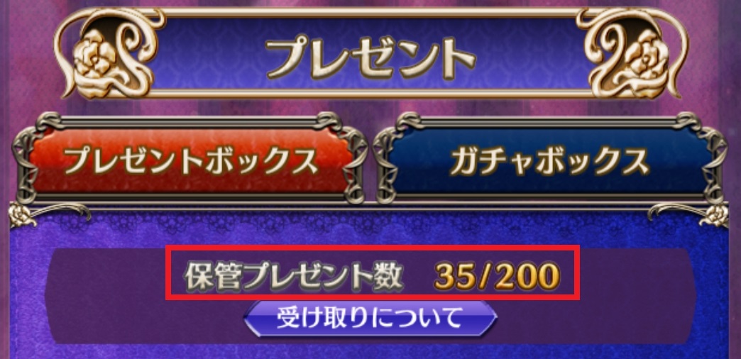 プレゼントには表示上限があります。上限はプレゼントボックス、ガチャボックスでそれぞれ異なります。 上限を超えると古いプレゼントから非表示になり、表示されているプレゼントを受け取ると再表示されます。 「使い魔以外を受け取る」もしくは「全て受け取る」をタップすることで、上限を超えて非表示となったアイテムも受け取ることができますが、非表示になっている使い魔は獲得されずに削除されますのでご注意ください。