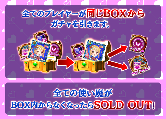 - 【BOX内すべての中身が0】もしくは【BOX内の目玉使い魔の残数が0】になった場合、「SOLD OUT」となり、本シェアBOXガチャを引くことができなくなります。