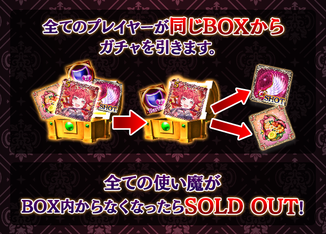- 【BOX内すべての中身が0】もしくは【BOX内の目玉使い魔の残数が0】になった場合、「SOLD OUT」となり、本シェアBOXガチャを引くことができなくなります。