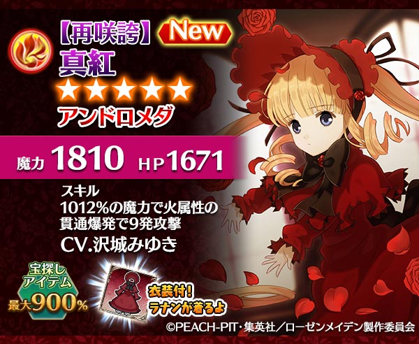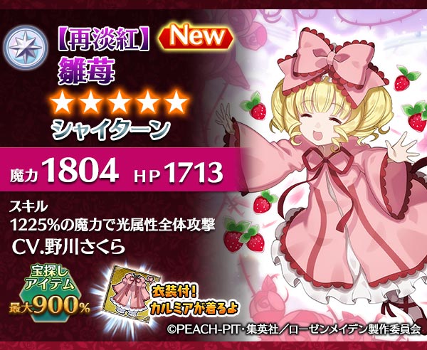 ・【再淡紅】雛苺の衣装は、雛苺の衣装と同一となります。既に衣装持ちの使い魔を入手済みの場合は別途衣装は付与されません。