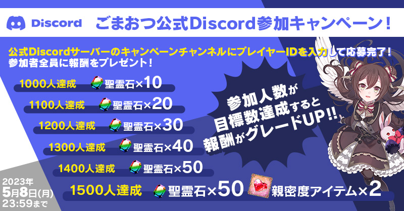5/8(月)23:59までにごまおつ公式Discordに参加した人数に応じて達成報酬をキャンペーン参加者全員のプレゼントにお送りします。