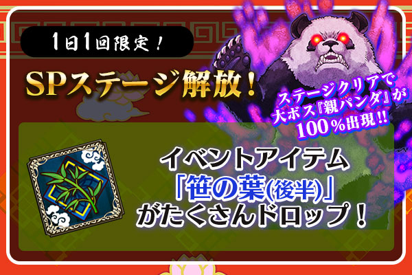 | 終了日時 | 2023/5/30(火) 23:59 | 解放条件 | 笹の葉(後半)を1000個消費しよう |