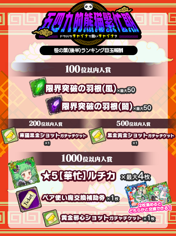 【五四九的熊猫繁忙期~ドタバタチャイナで働いチャイナ?~】は、期間を分けて2回イベントランキングを実施いたします。