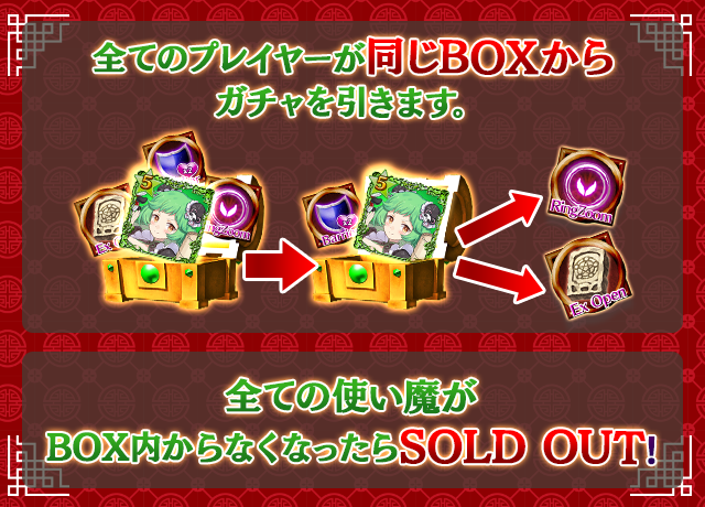 - 【BOX内すべての中身が0】もしくは【BOX内の目玉使い魔の残数が0】になった場合、「SOLD OUT」となり、本シェアBOXガチャを引くことができなくなります。