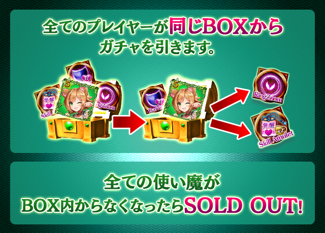 - 【BOX内すべての中身が0】もしくは【BOX内の目玉使い魔の残数が0】になった場合、「SOLD OUT」となり、本シェアBOXガチャを引くことができなくなります。