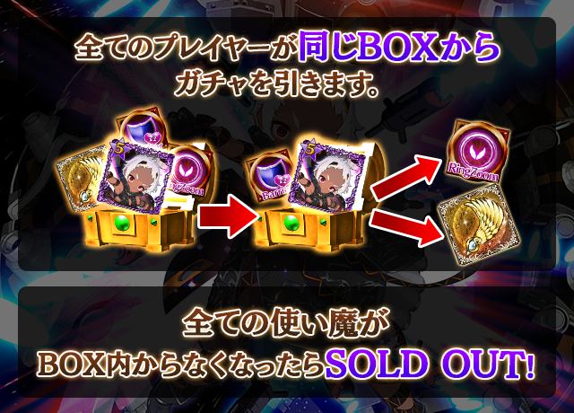 - 【BOX内すべての中身が0】もしくは【BOX内の目玉使い魔の残数が0】になった場合、「SOLD OUT」となり、本シェアBOXガチャを引くことができなくなります。