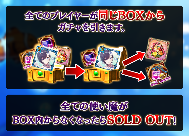 - 【BOX内すべての中身が0】もしくは【BOX内の目玉使い魔の残数が0】になった場合、「SOLD OUT」となり、本シェアBOXガチャを引くことができなくなります。