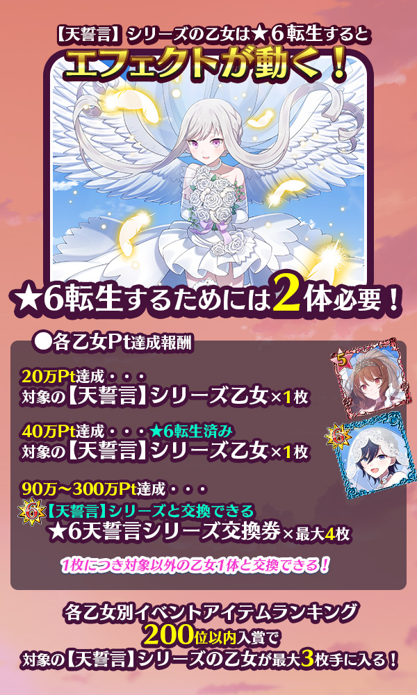 - さらに、各乙女Pt達成報酬の「★6天誓言シリーズ交換券(乙女)A~E」は★6転生済みで交換可能!