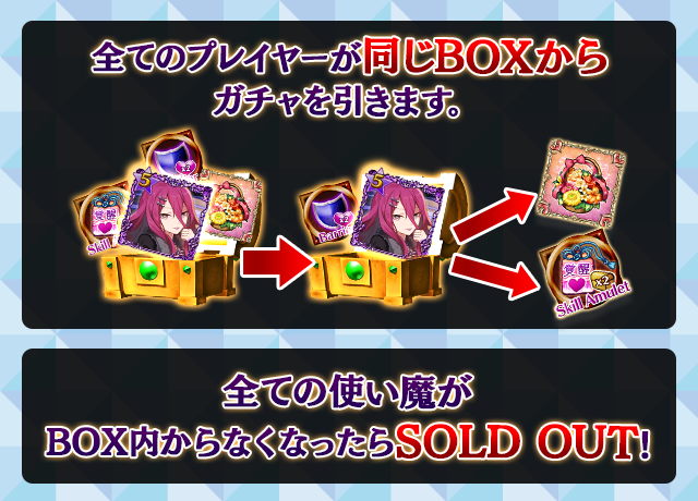 - 【BOX内すべての中身が0】もしくは【BOX内の目玉使い魔の残数が0】になった場合、「SOLD OUT」となり、本シェアBOXガチャを引くことができなくなります。
