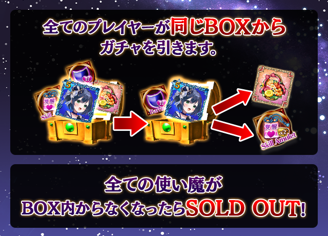 - 【BOX内すべての中身が0】もしくは【BOX内の目玉使い魔の残数が0】になった場合、「SOLD OUT」となり、本シェアBOXガチャを引くことができなくなります。