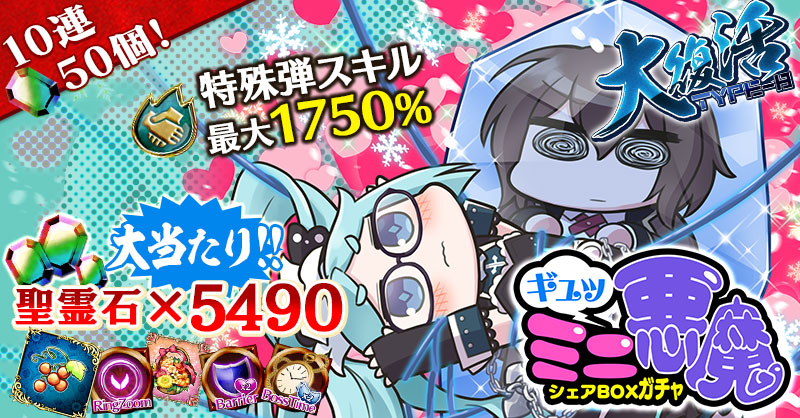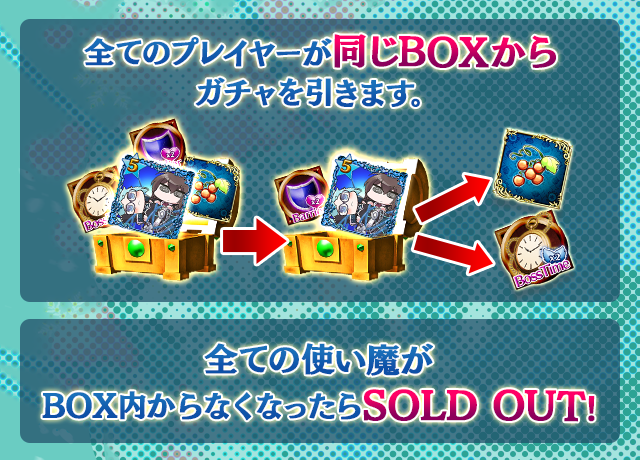 - 【BOX内すべての中身が0】もしくは【BOX内の目玉使い魔の残数が0】になった場合、「SOLD OUT」となり、本シェアBOXガチャを引くことができなくなります。