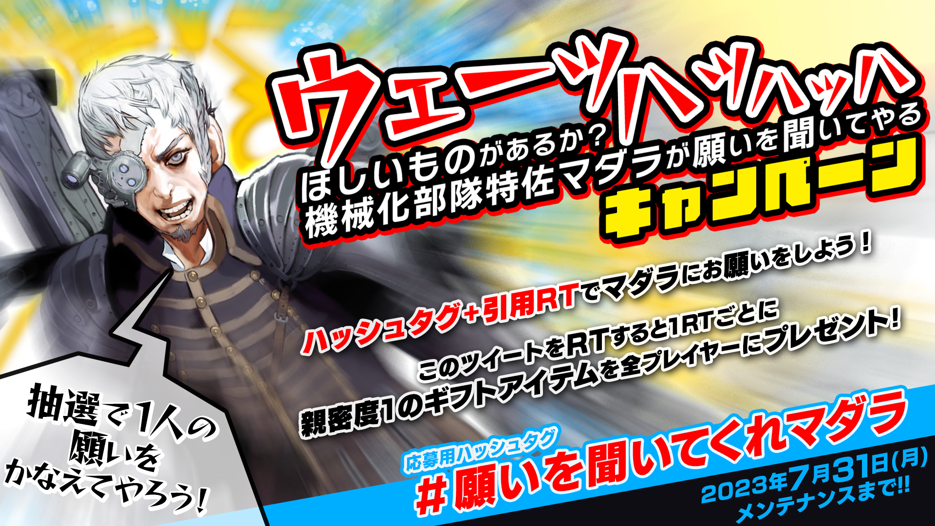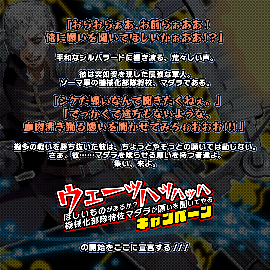 \ウェーッハッハッハ/ ほしいものがあるか?機械化部隊特佐マダラが願いを聞いてやるキャンペーン