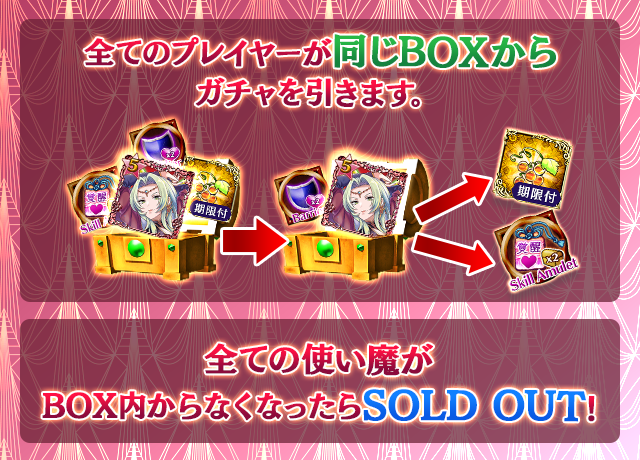 - 【BOX内すべての中身が0】もしくは【BOX内の目玉使い魔の残数が0】になった場合、「SOLD OUT」となり、本シェアBOXガチャを引くことができなくなります。