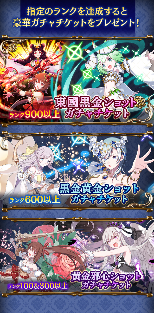 期間中にプレイヤーランク100、300、600、900に到達すると、強ショットが確定するガチャチケットをプレゼント!