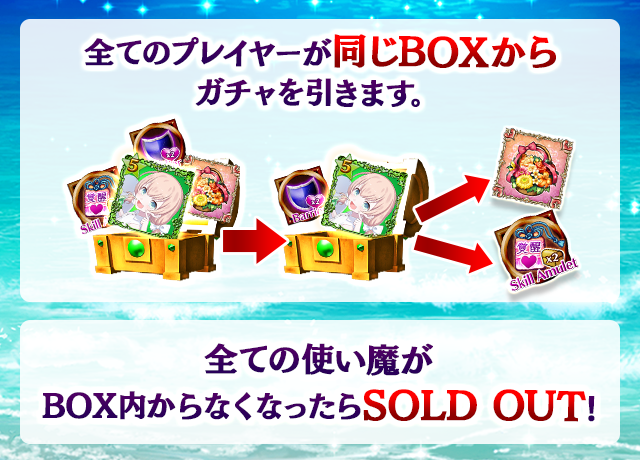 - 【BOX内すべての中身が0】もしくは【BOX内の目玉使い魔の残数が0】になった場合、「SOLD OUT」となり、本シェアBOXガチャを引くことができなくなります。