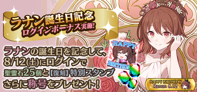ラナンの誕生日を記念して、誕生日当日にログインすると「聖霊石:25個」と、掲示板で使用できる【復刻】特別スタンプや、称号をプレゼント!!
