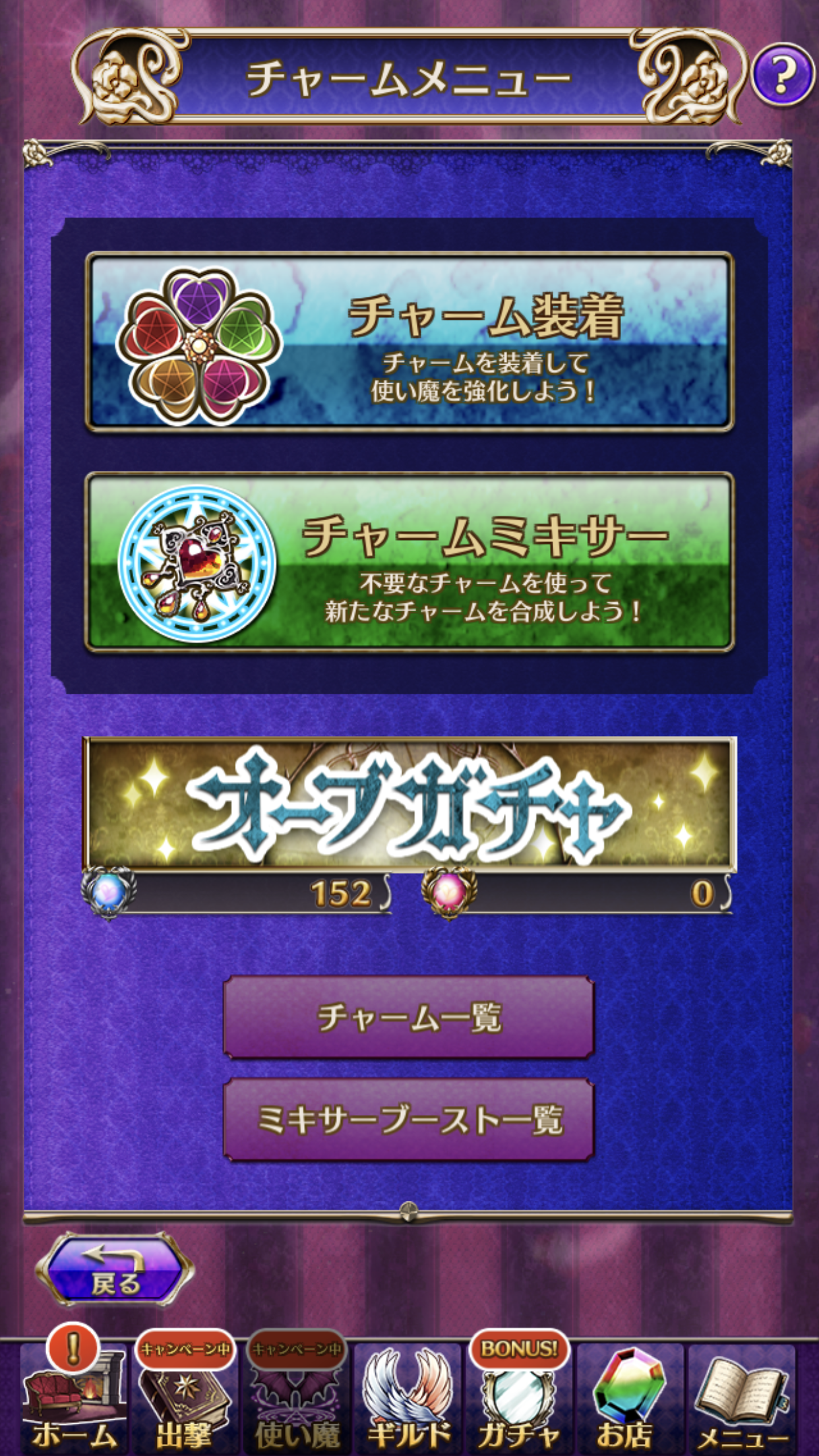 使い魔には「チャーム」というアイテムを装着できる枠がある。チャームには魔力アップ、HPアップなど5種類の効果があり、各種類1つだけ装着できる。