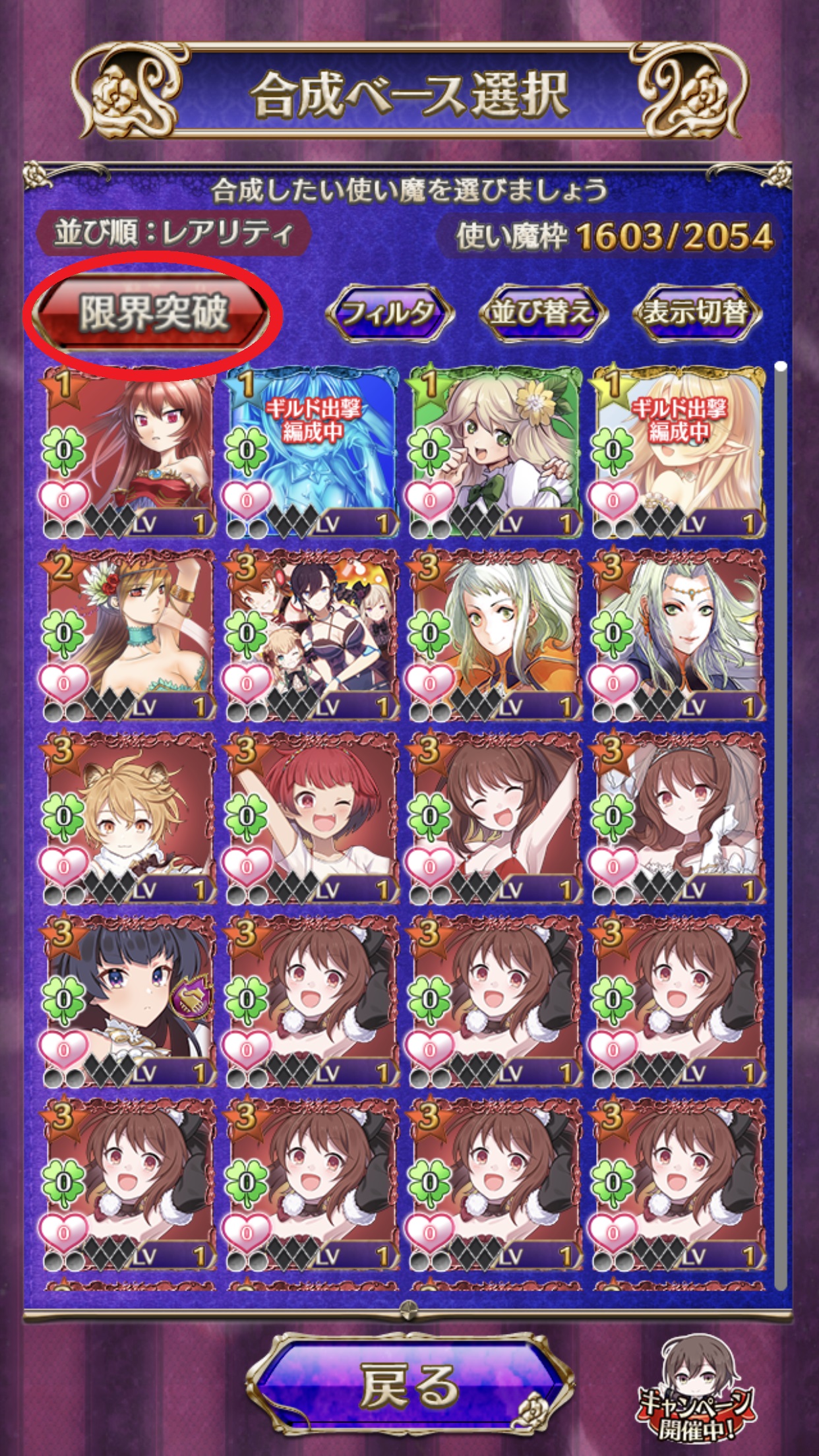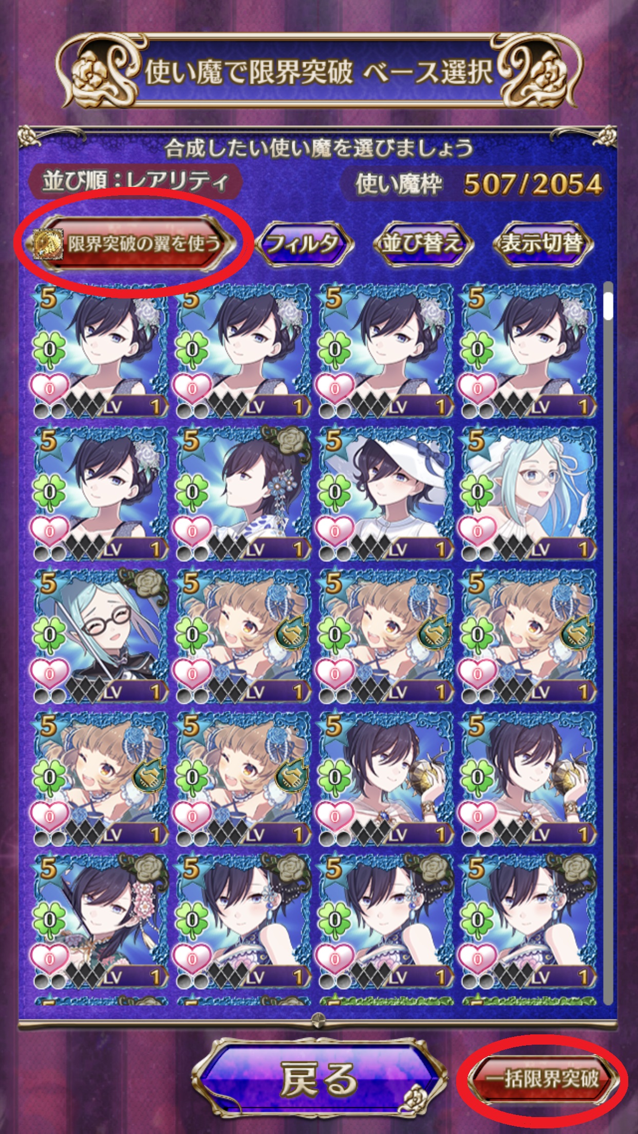 使い魔メニュー>[強化合成・限界突破]から1体ずつ選んで限界突破できるほか、限界突破可能な使い魔を複数まとめて選択できる「一括限界突破」機能もあるぞ!