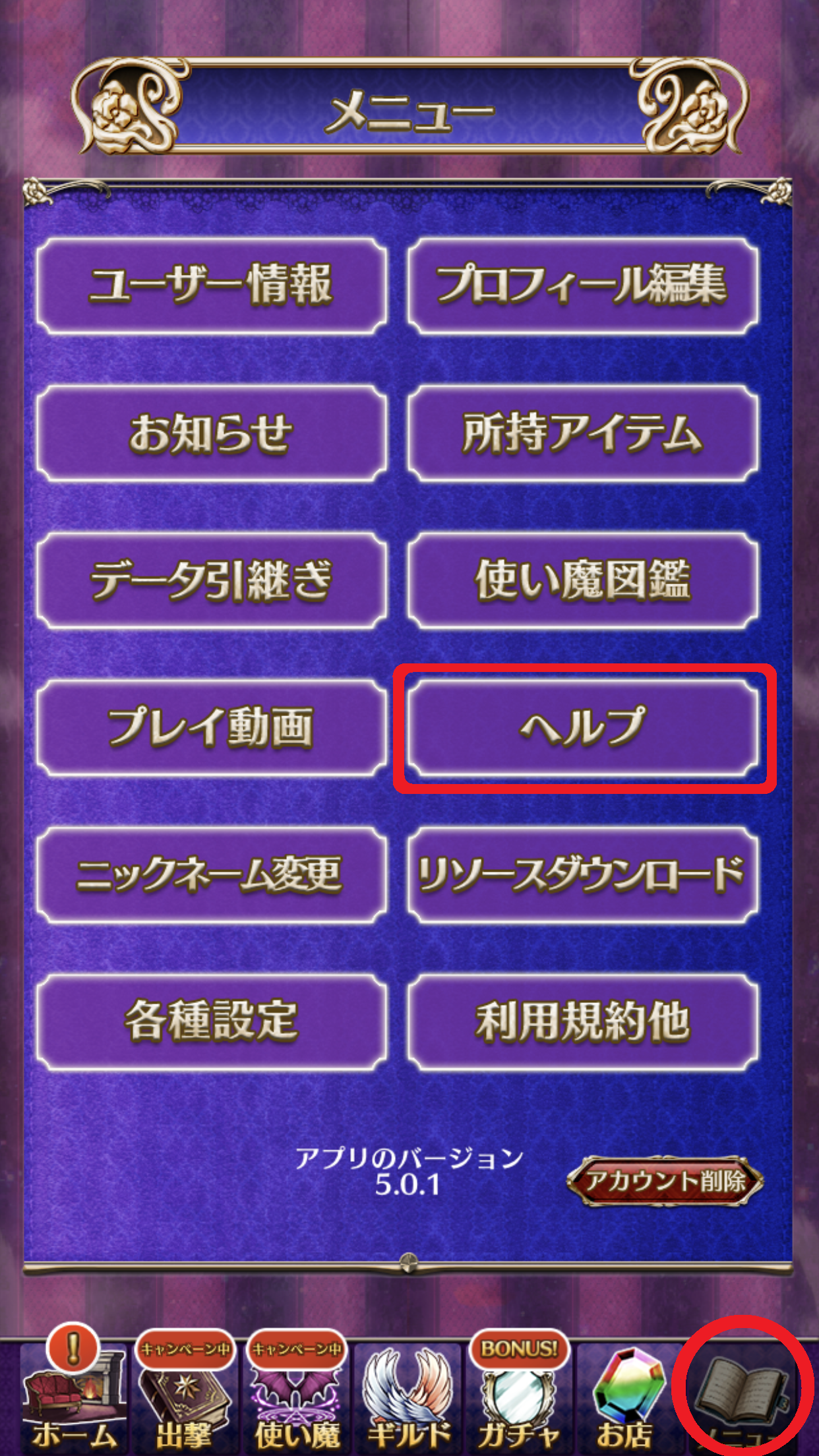 ホーム画面下部[メニュー]>[ヘルプ]より見ることができます。