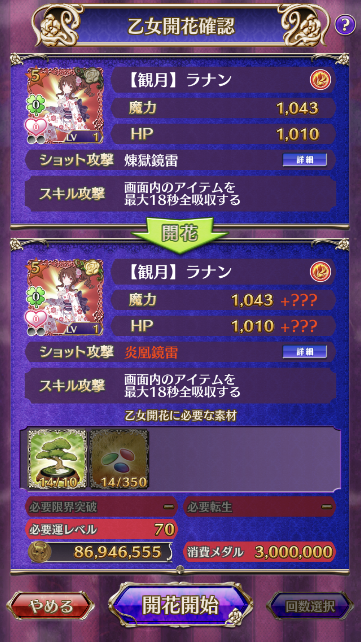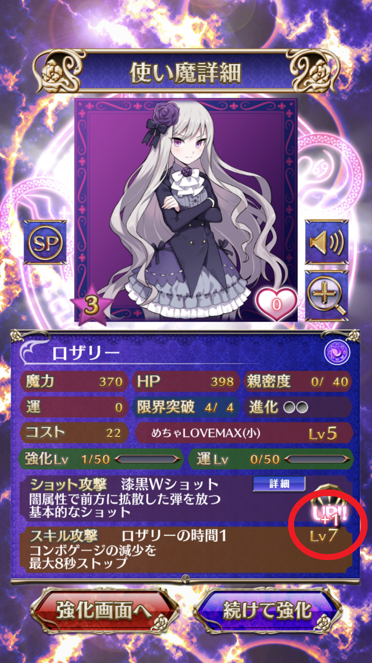 一部の使い魔は「乙女開花」をすることができ、開花するとショットやスキルが変化したり、開花するたびに魔力かHPどちらか一つの数値がランダムで上昇する!