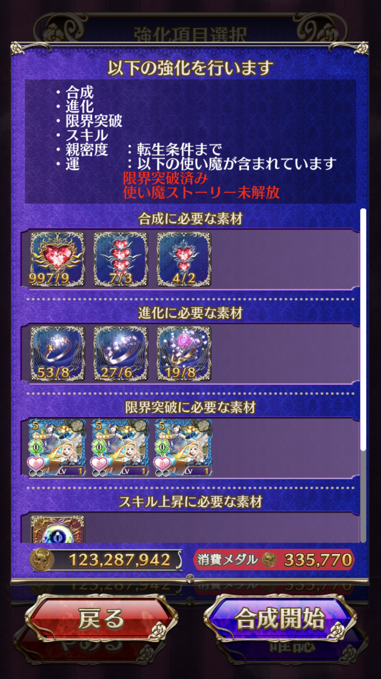 使い魔それぞれに指定された限界突破数と親密度数を達成することで転生させることができる。
