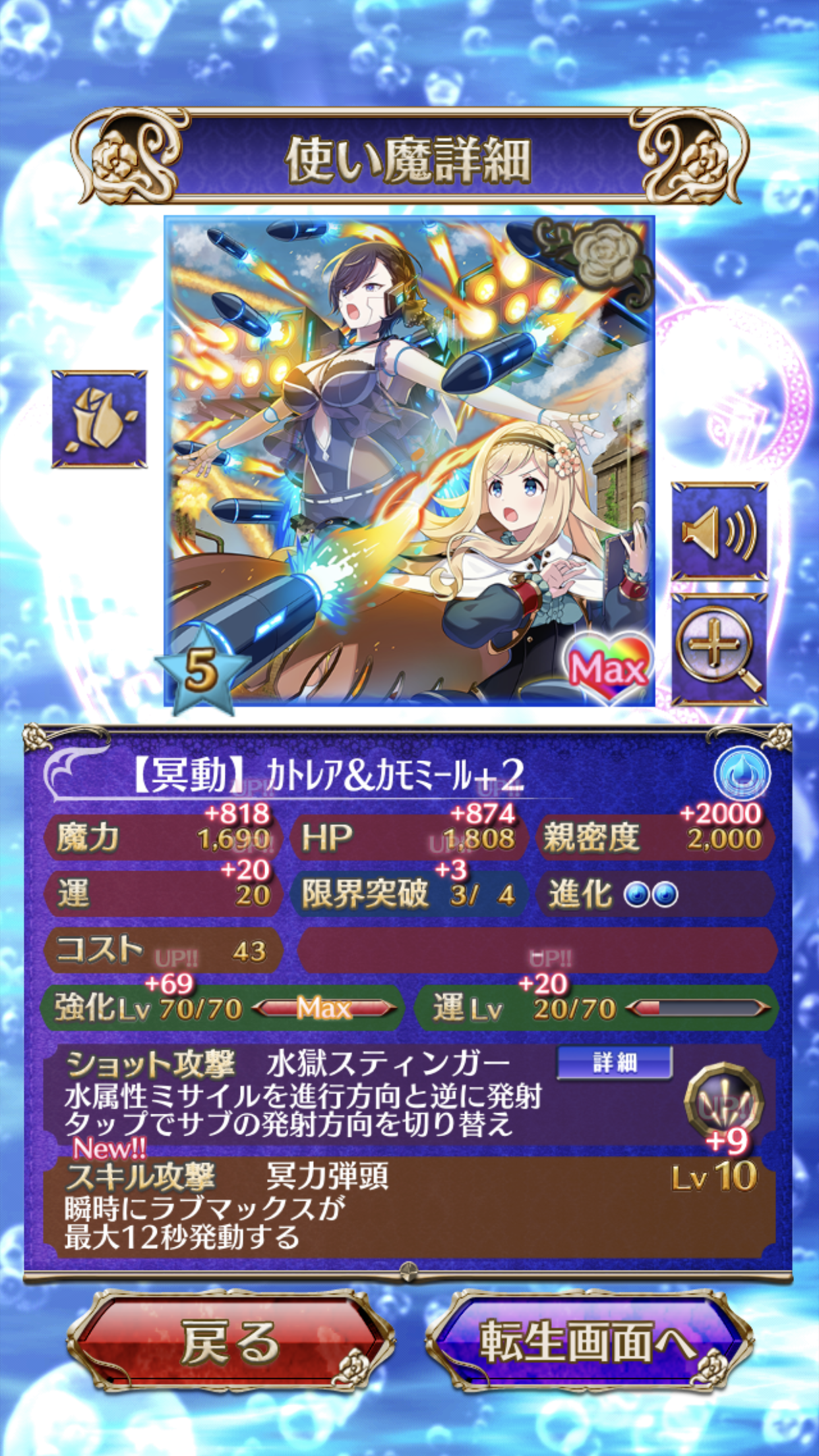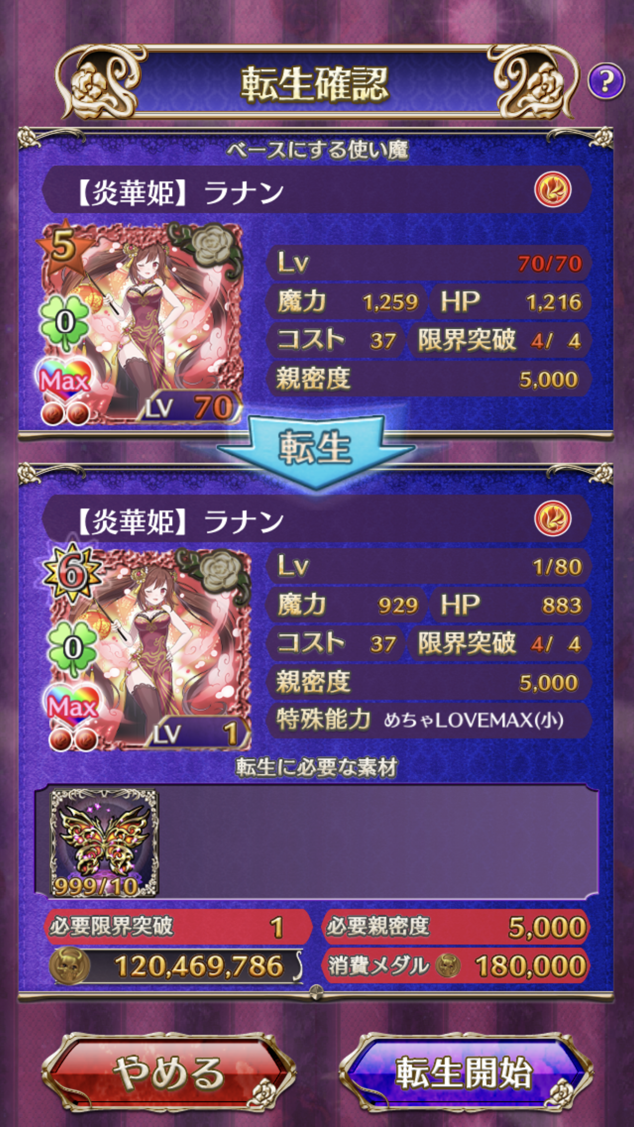 レアリティとレベルの上限が上がることで、さらに魔力とHPが上昇する! 現在は「★6」が最高レアリティとなっており、★3の使い魔を最高レアリティにすることも可能だ。 転生には「生命の蝶」などの転生素材が必要!