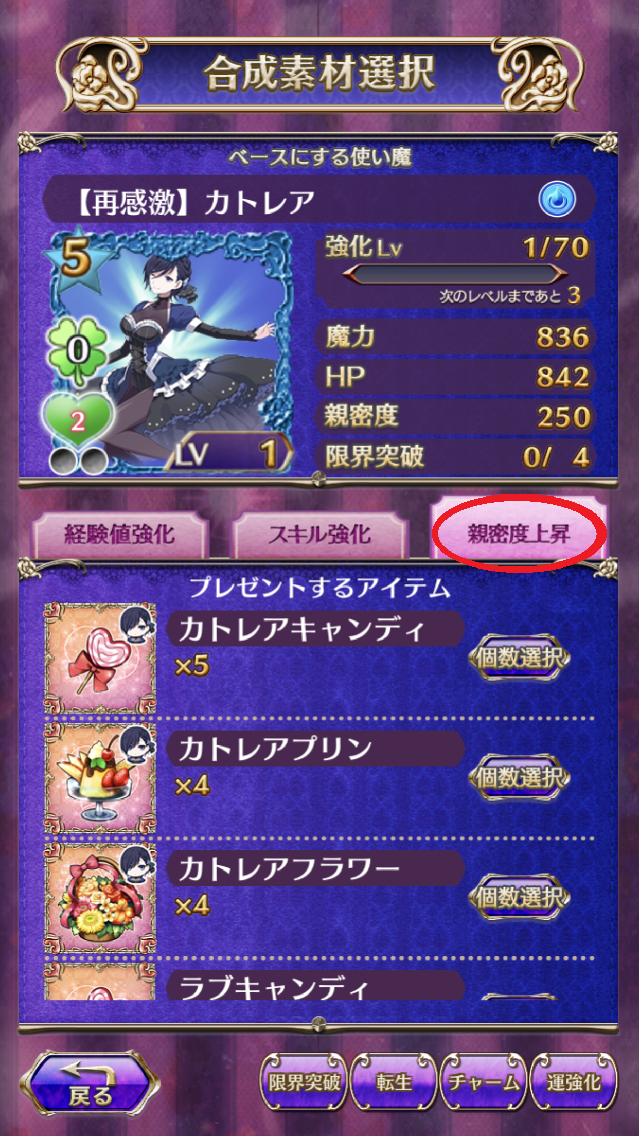 使い魔の親密度を上げるには編成してステージをクリアするか、「親密度ギフト」というアイテムが必要!