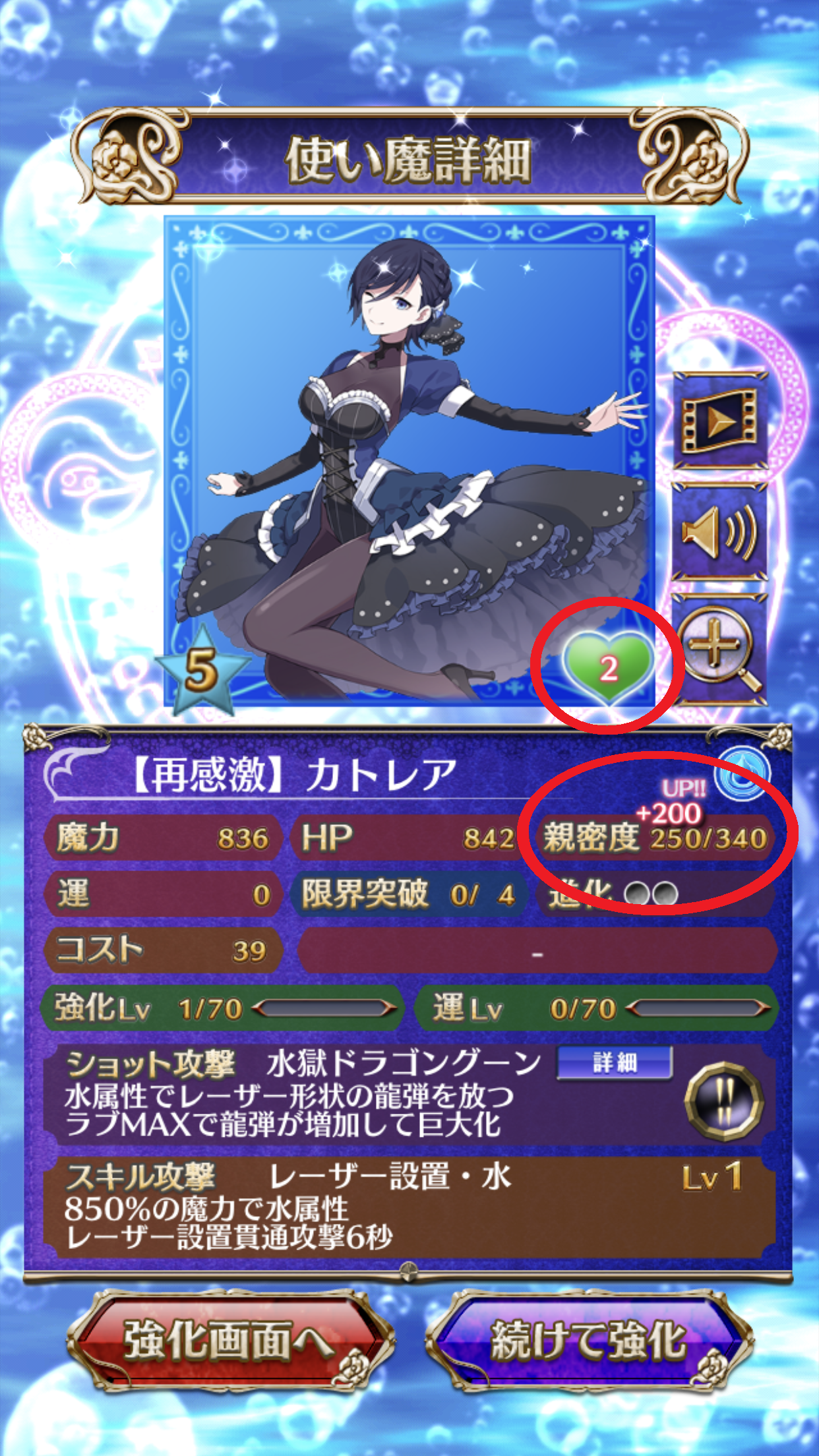 親密ランクが最大になると「使い魔ストーリー」が読める特典もあるので、いろいろな使い魔の親密度を上げよう!