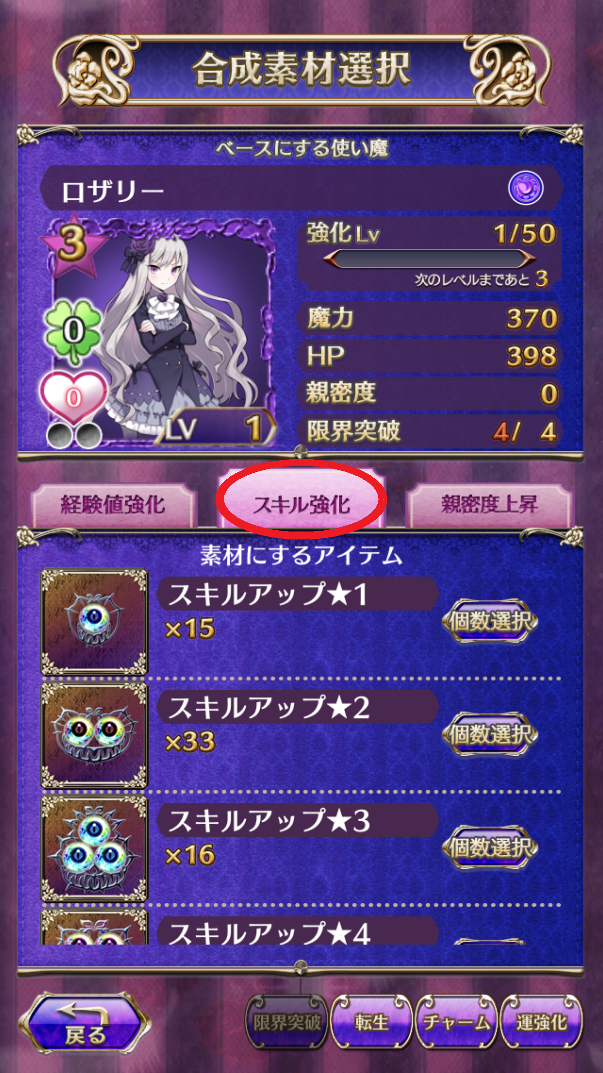 使い魔メニュー>[強化合成・限界突破]よりスキルレベルを上げたい使い魔を選択し[スキル強化]タブより「スキル強化」をすることができます。