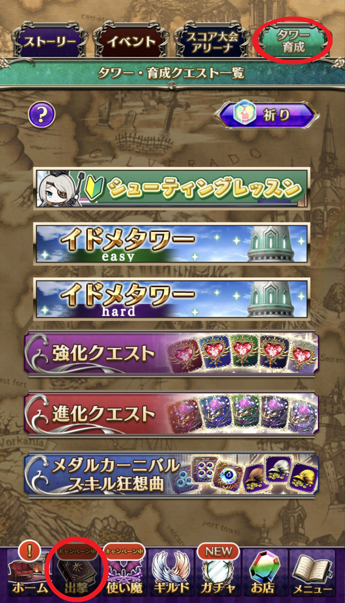 ホーム画面下部[出撃]>[タワー育成]よりイドメタワーや育成クエストに出撃することができます。