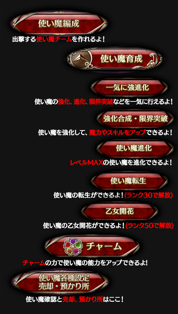 使い魔メニュー>[一気に強進化]より使い魔の「レベルアップ」、「進化」、「限界突破」、「スキル」、「親密度」、「運」が一気に強化できる!