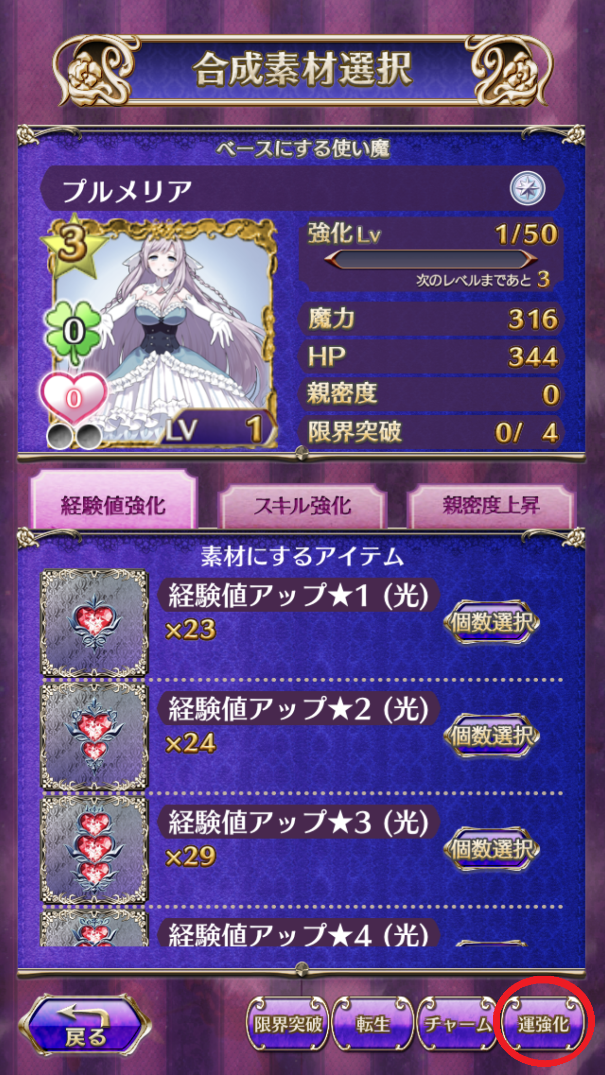 使い魔メニュー>[強化合成・限界突破]より運レベルアップしたい使い魔を選択し、右下[運強化へ]ボタンから素材にする使い魔を選択することで「運強化」をすることができます。