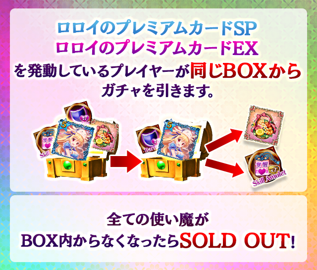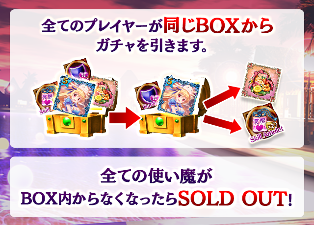 - 【BOX内すべての中身が0】もしくは【BOX内の目玉使い魔の残数が0】になった場合、「SOLD OUT」となり、本シェアBOXガチャを引くことができなくなります。