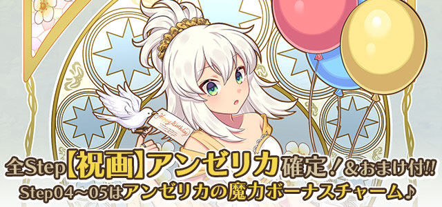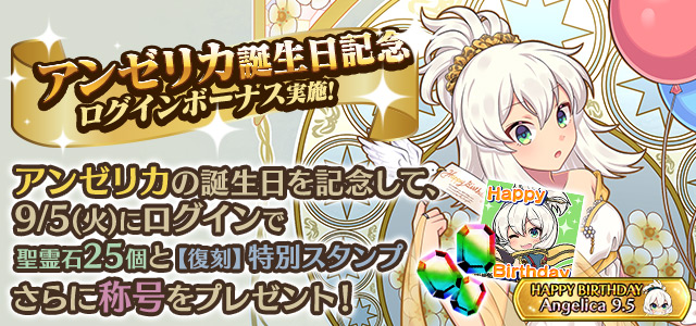 アンゼリカの誕生日を記念して、誕生日当日にログインすると「聖霊石:25個」と、掲示板で使用できる【復刻】特別スタンプや、称号をプレゼント!!