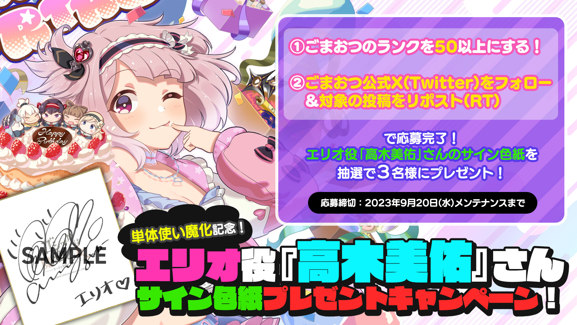 ごまおつ公式X(Twitter)をフォロー&該当の投稿をリポスト(RT)で、ごまおつでランク50以上のプレイヤーIDを持っている方の中から抽選で3名様にエリオ役「高木美佑」さんのサイン色紙が当たるキャンペーンを実施します‼