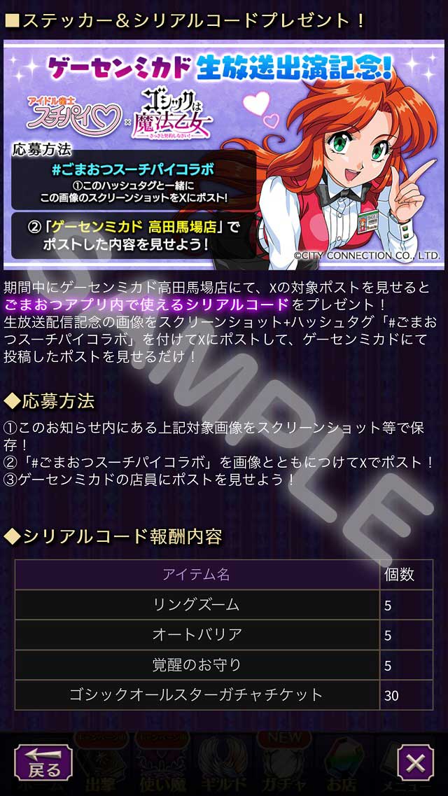 期間中にゲーセンミカド高田馬場店にて、Xの対象ポストを見せるとごまおつアプリ内で使えるシリアルコードをプレゼント!