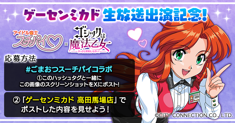 生放送配信記念の画像をスクリーンショット+ハッシュタグ「#ごまおつスーチパイコラボ」を付けてXにポストして、ゲーセンミカドにて投稿したポストを見せるだけ!