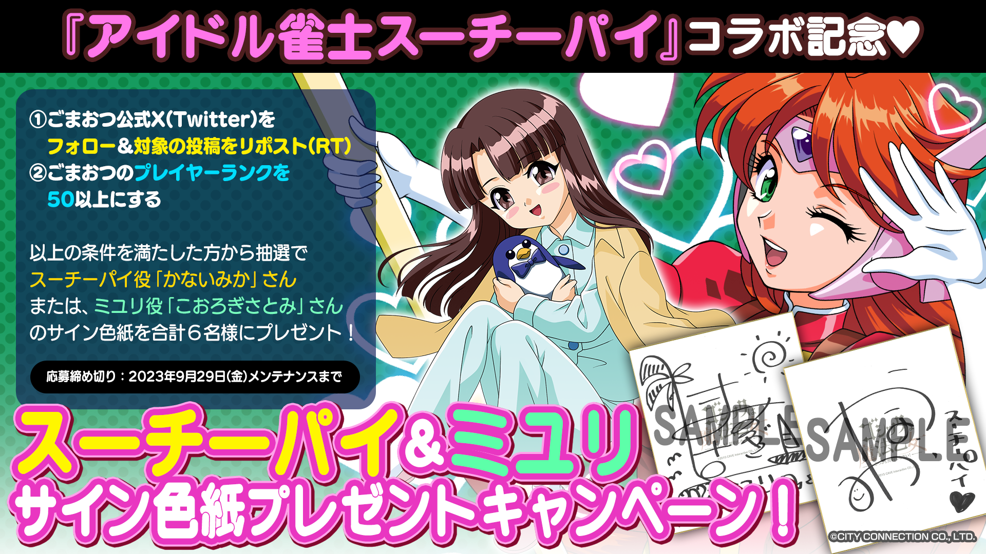 ごまおつ公式X(Twitter)をフォロー&該当の投稿をリポスト(RT)で、ごまおつでランク50以上のプレイヤーIDを持っている方の中から抽選で合計6名様にスーチーパイ役「かないみか」さん、またはミユリ役「こおろぎさとみ」さんのサイン色紙が当たるキャンペーンを実施中!
