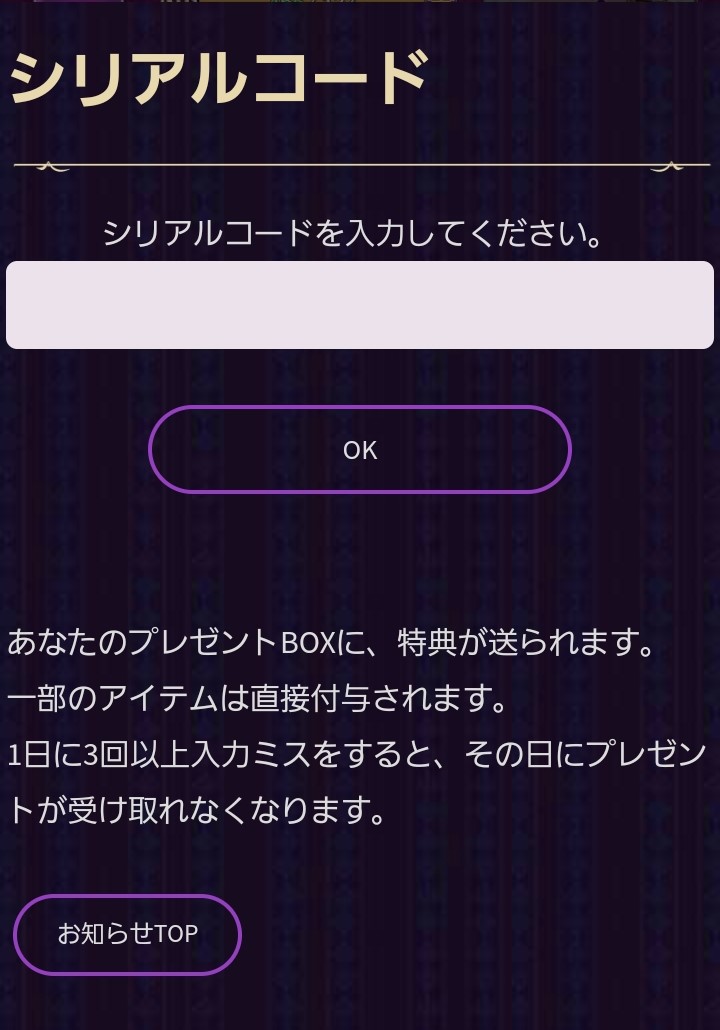 ※期限が過ぎたシリアルコードを入力しても、アイテムを受け取ることはできません。ご注意ください。