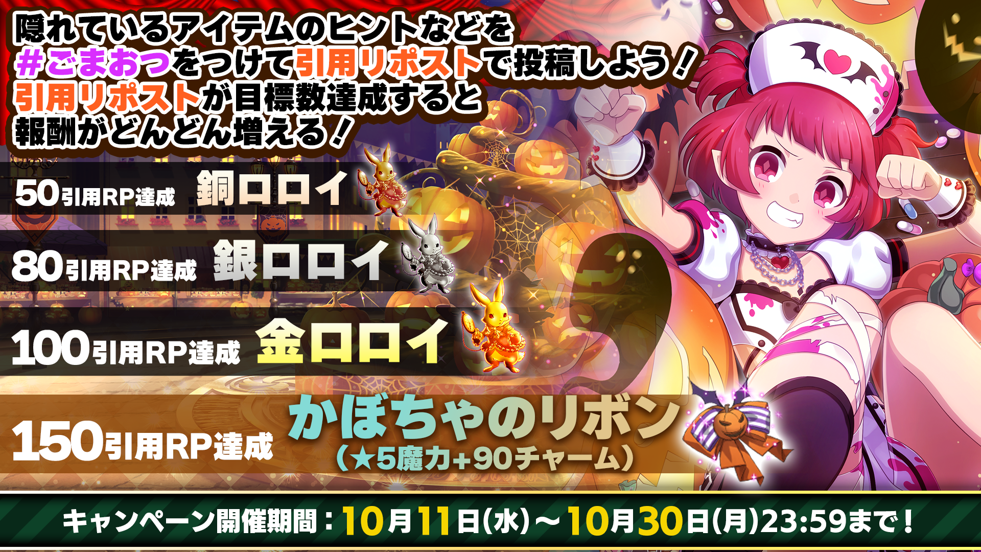 150引用リポスト達成でかぼちゃのリボン(★5魔力+90チャーム)が手に入る!
