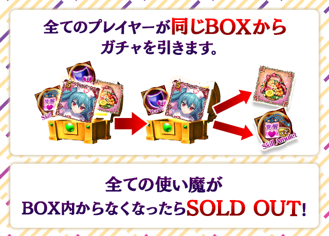 - 【BOX内すべての中身が0】もしくは【BOX内の目玉使い魔の残数が0】になった場合、「SOLD OUT」となり、本シェアBOXガチャを引くことができなくなります。