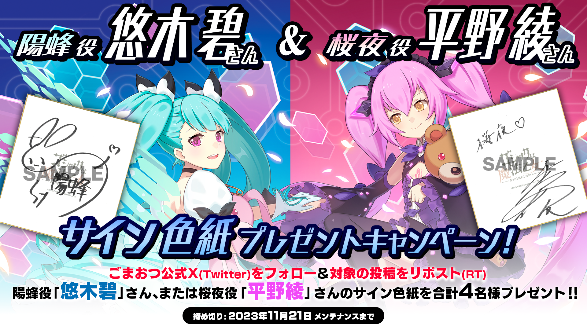 ごまおつ公式X(Twitter)をフォロー&該当の投稿をリポストで、ごまおつでランク50以上のプレイヤーIDを持っている方の中から抽選で合計4名様に陽蜂役「悠木碧」さん、または桜夜役「平野綾」さんのサイン色紙が当たる‼